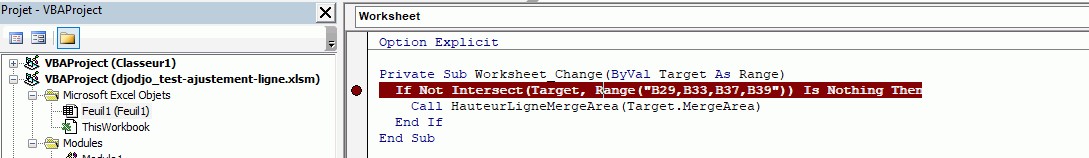 Quand vous êtes dans le code de votre Feuil1, mettez un point d'arrêt (F9) sur la 1ère ligne