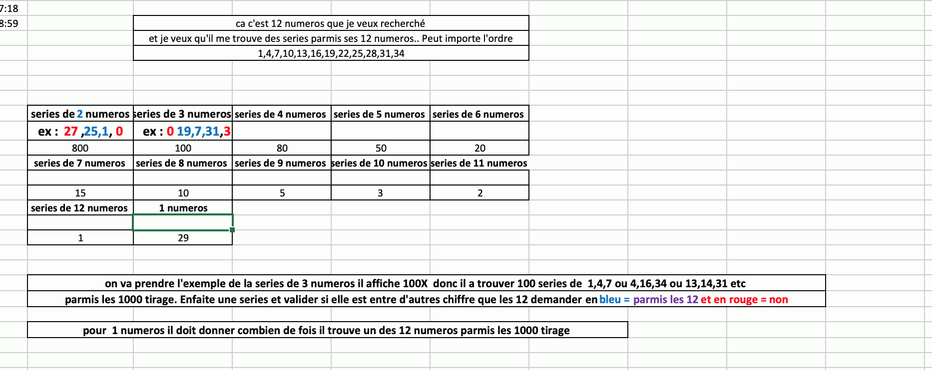 et peut importe l’ordre des numéros dans la séries sur l'exemple de la séries de 3 numéros nous avons : 3 ,19 , 7 ,31 , 0 qui et enfermé par le 3 et le 0 la series et valider car le 3 et le 0 ne font pas partie des 12 chiffre donc il compte 1 series trouver mais on aurais pu aussi avoir ca 3, 7 ,31 ,19 , 0 ou 3 ,31 ,19 ,7 ,0 c'est aussi valide.