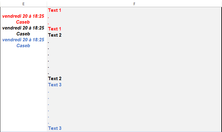 Comment faire pour aligner la date et le user de la cellule E avec les 2 premières lignes du commentaire de la cellule F ?