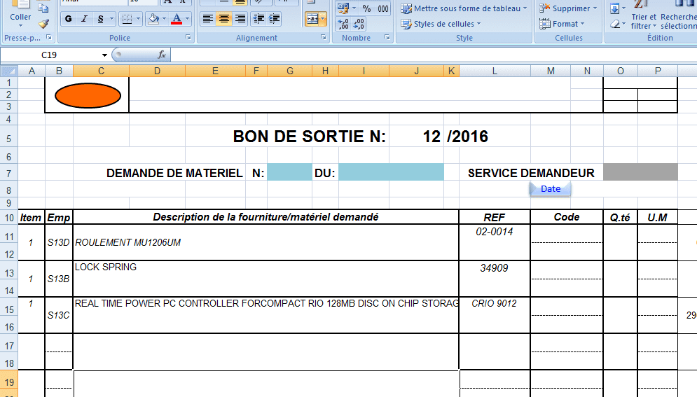 Et si je choisis une valeur disponible, en cliquant sur ‘’Sortir’’, j’obtiens bien les données dans la feuille ‘’BON DE SORTIE’’