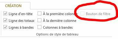J'aimerais savoir si il y a moyen d'enlever les boutons de filtre de mon tableau Excel sachant que l'option n'apparait pas dans les "outils de tableau"