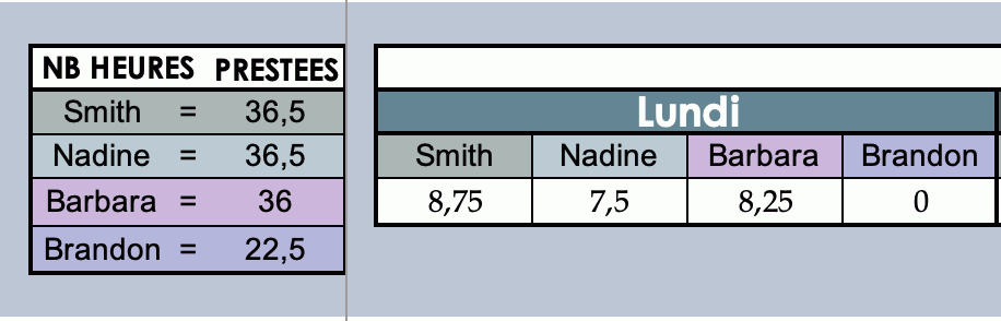 Malheureusement, j'ai modifier la colonne Smith du lundi commette le voudrais c'est dire que si la première tranche d'une heure est un élément, les 3 cellules suivantes sont la même choses.