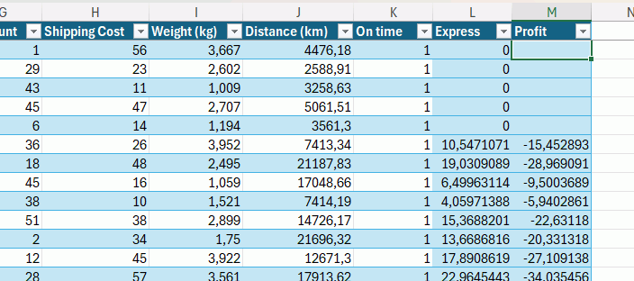 Basé sur une table de données, contenant les colonnes: ID, Date de Commande, Entrepot, Mode de transport (avion, bateau etc), Prix, Cout, Discount, Cout de transport, poids, distance et "A temps" (noté 1 si la livraison est arrivé a temps et 0 sinon), et respectivement des colonnes A a K