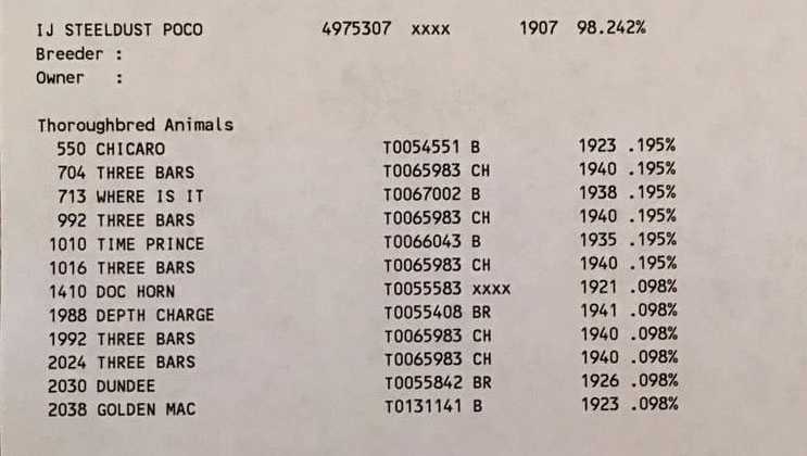 Concernant le calcul % de la race, je vous joins le résultat pour un autre Quarter (IJ Steeldust Poco) où l'on retrouve quelques pur sang anglais en 9e et 10e génération (donc 98.242% de race Quarter Horse).