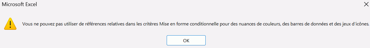 Je souhaiterais appliquer cette mise en forme conditionnelle automatiquement à toute les lignes. Le soucis c'est que je suis obliger de figer la ligne et la colonne avec le symbole $ car Excel refuse une référence relative, en l'occurrence une cellule ciblée non figée, comme critère dans la formule pour une mise en forme conditionnelle type nuance de couleur.