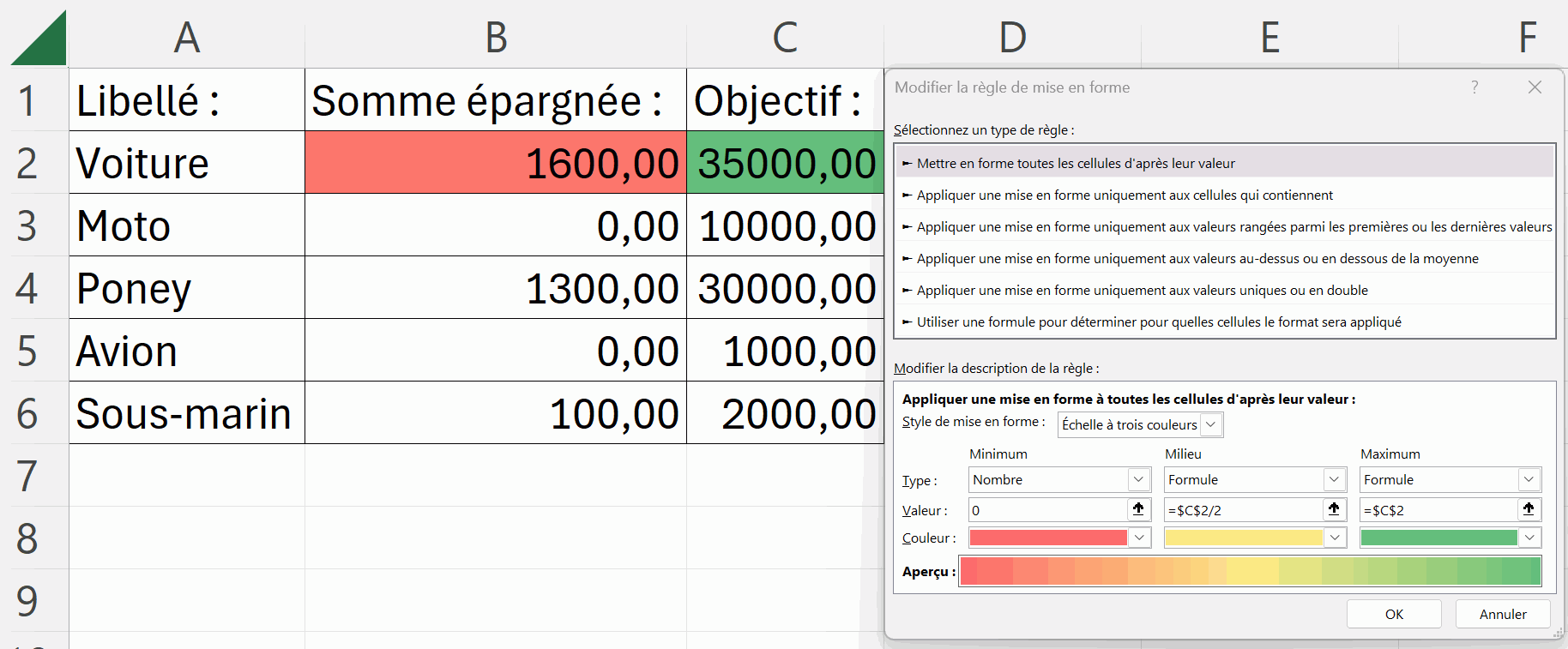 Cette mise en forme conditionnelle me permet de colorer la cellule "somme épargnée" pour la ligne voiture en fonction du montant de l'écart avec la cellule objectif pour la voiture.