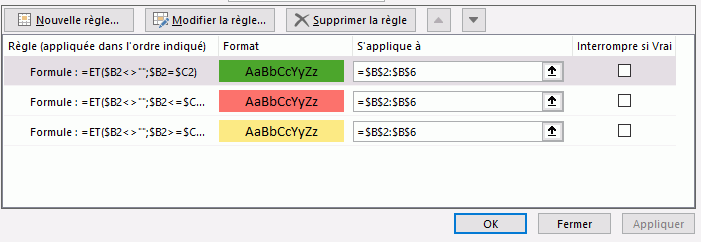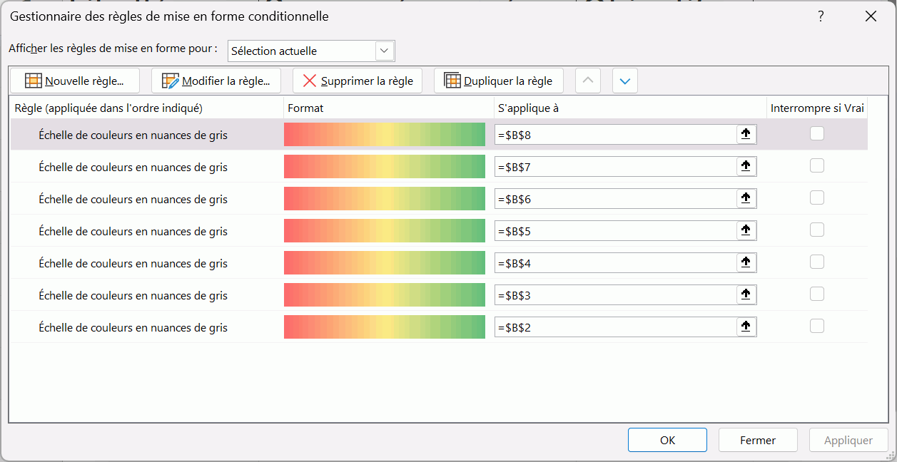 Du coup, je suis obligé de créer cette mise en forme conditionnelle manuellement pour chaque ligne comme tu l'as fait (cf photo ci-dessous) ?