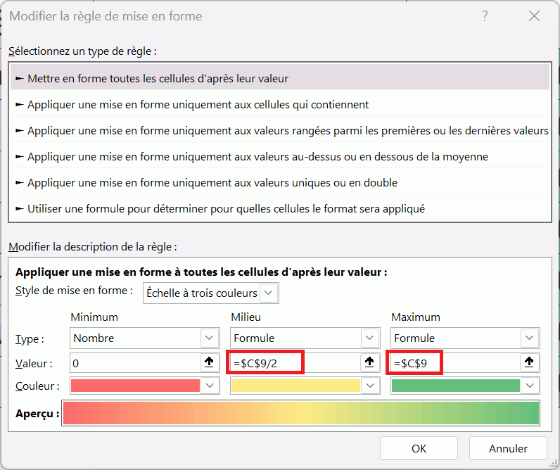 Existe-t-il un moyen d'appliquer une mise en forme conditionnelle avec une échelle à trois couleur sans avoir à figer la ligne dans la formule ?