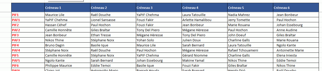 Sachant qu'il y'a 6 créneau sur la journée, chaque nom doit apparaître 6 fois du coup.