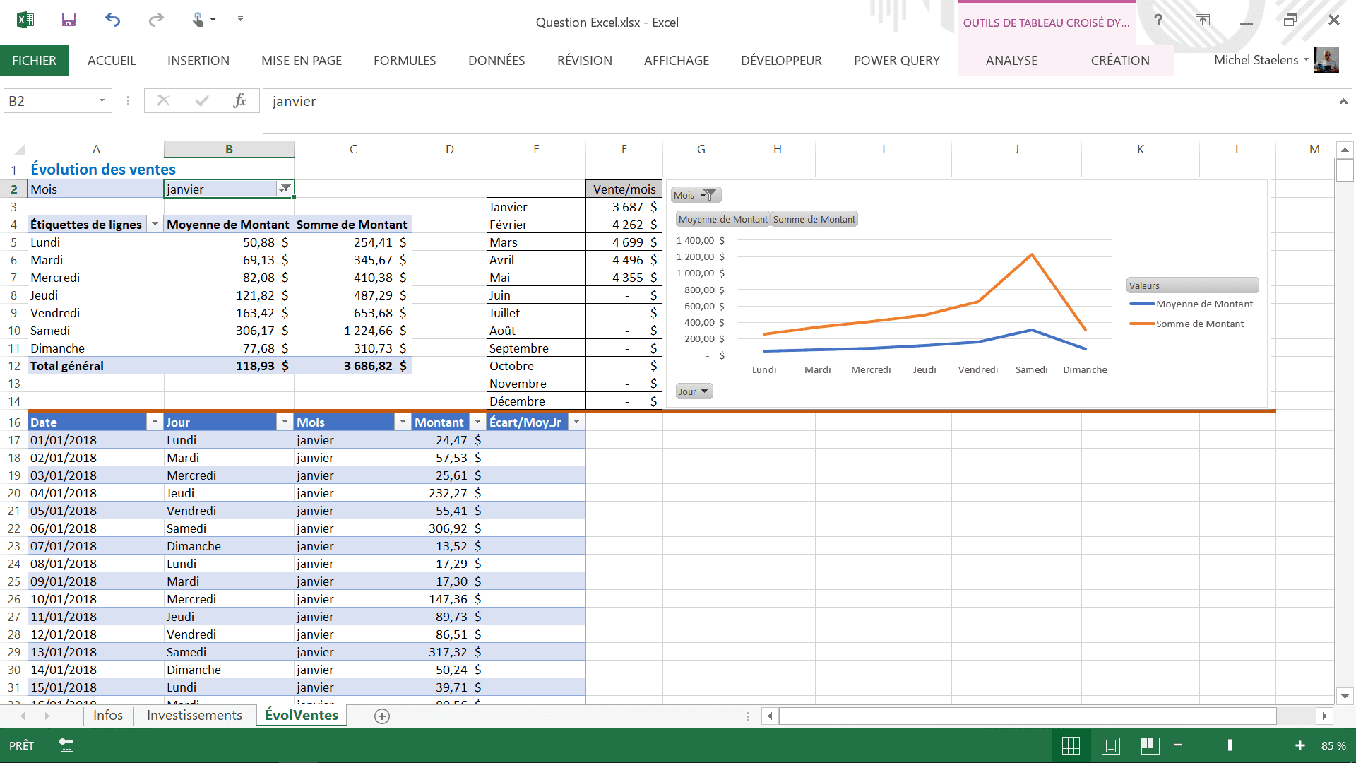 J'aimerais, lorsque je filtre un mois dans la colonne A, que les tableaux en haut affichent les valeurs de semaine ou de mois selon les cas.
