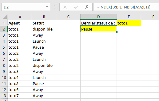 Comment rechercher la dernière valeur dans un tableau excell (table.2), esxemple je veux chercher le dernier statut de toto1 dans la table.2