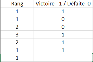 J'ai deux colonnes, la première des Rang et la deuxième avec victoire (=1) ou défaite (=0).