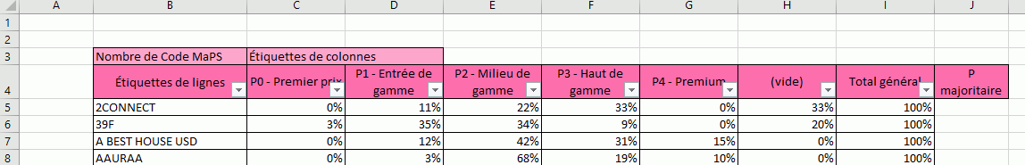 Je souhaiterais obtenir une formule en cellule J5 que je pourrais ensuite appliquer aux autres étiquettes de lignes pour savoir quel est le P majoritaire (la cellule avec le plus haut pourcentage).