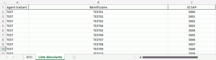 Je voudrais faire en sorte que lorsque je sélectionne le bénéficiaire (C3), le nom (D3) ainsi que l'ID (E3) s'affichent.