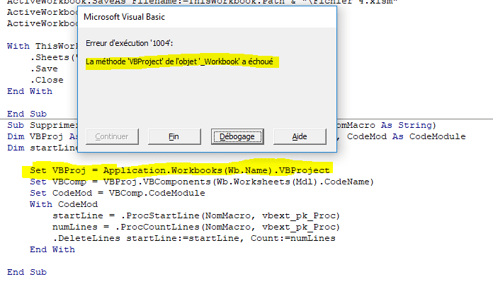C’est justement le fait que ce n’est pas ThisWorkbook qui est ouvert au moment où l’on veut supprimer la macro, mais la copie, soit ce nouveau Fichier 3 qui crée problème.