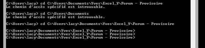 * ce qui est en rouge indique le répertoire actuel, donc après avoir appuyé sur Entrée, ça exécute la commande pour aller dans le répertoire indiqué, qui devient le nouveau répertoire en cours : C:\Users\lacy\Documents\Yves\Excel_Y\Forum - Provisoire>