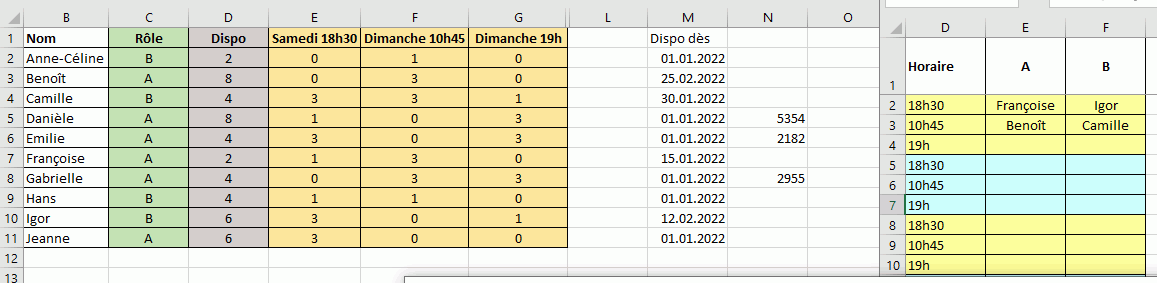 Dans le fichier V2, je suis parti sur une autre idée. En début de macro, j'inscris de manière invisible dans la colonne M de la feuille ''Personnes'' des disponibilités au 01.01.2022 (à gauche dans l'image ci-dessous) puis je cherche à remplir les colonnes E et F (avec les titres A et B) de la feuille "Dates et horaires" (à droite ci-dessous).