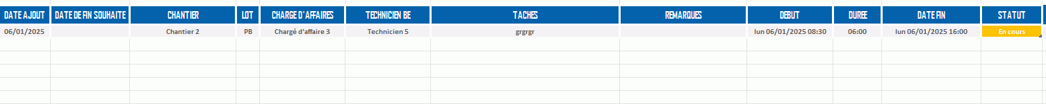 A partir de ce tableau je viens ajouter manuellement des informations tel que, la personne affecter à la tache, la durée, la date de début etc