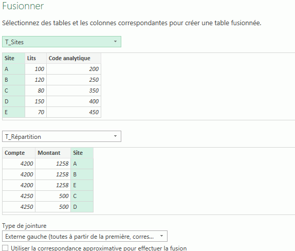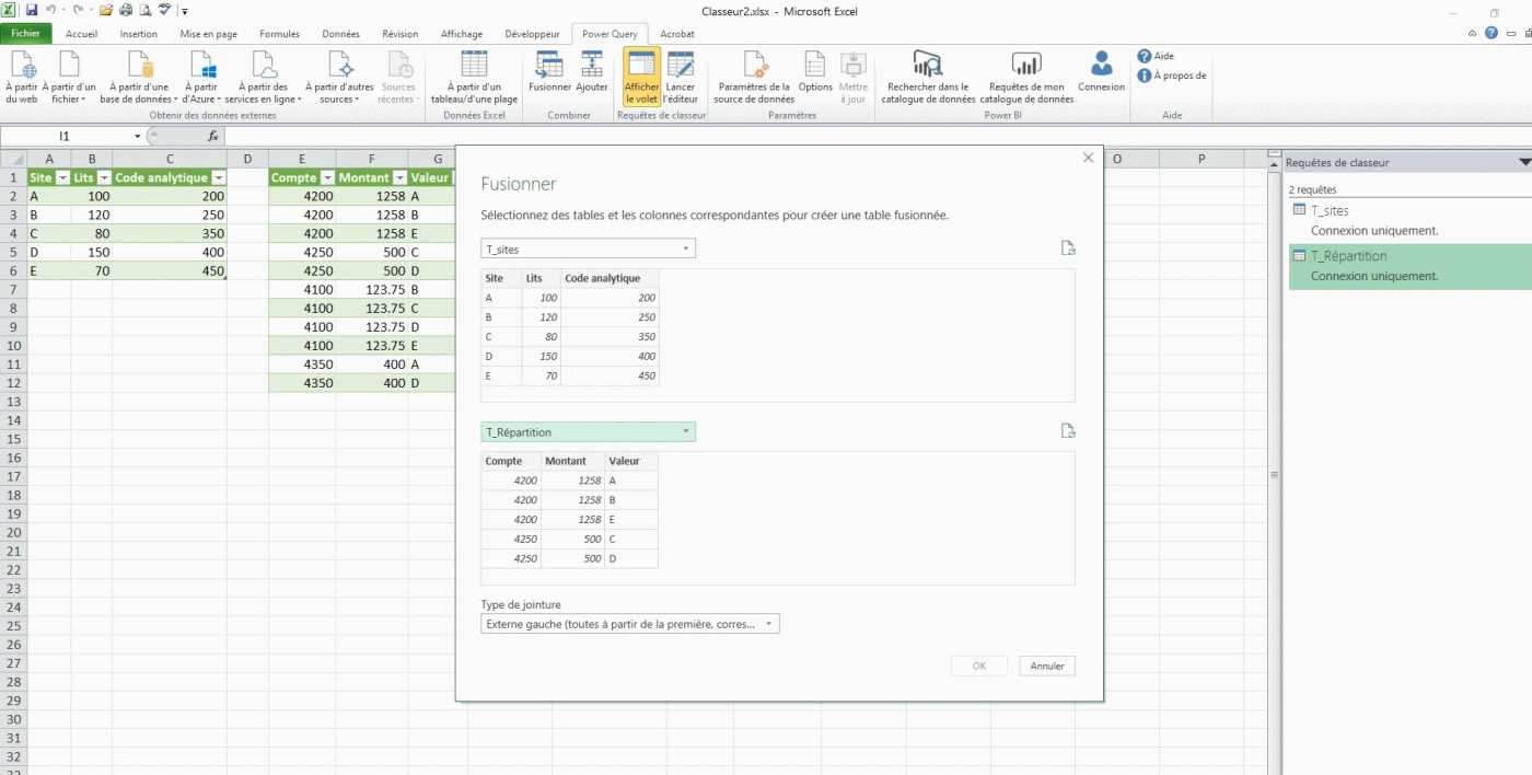 Le tableau devrait me permettre de générer l'écriture comptable (code du site, compte et montant) dans la zone en gris.