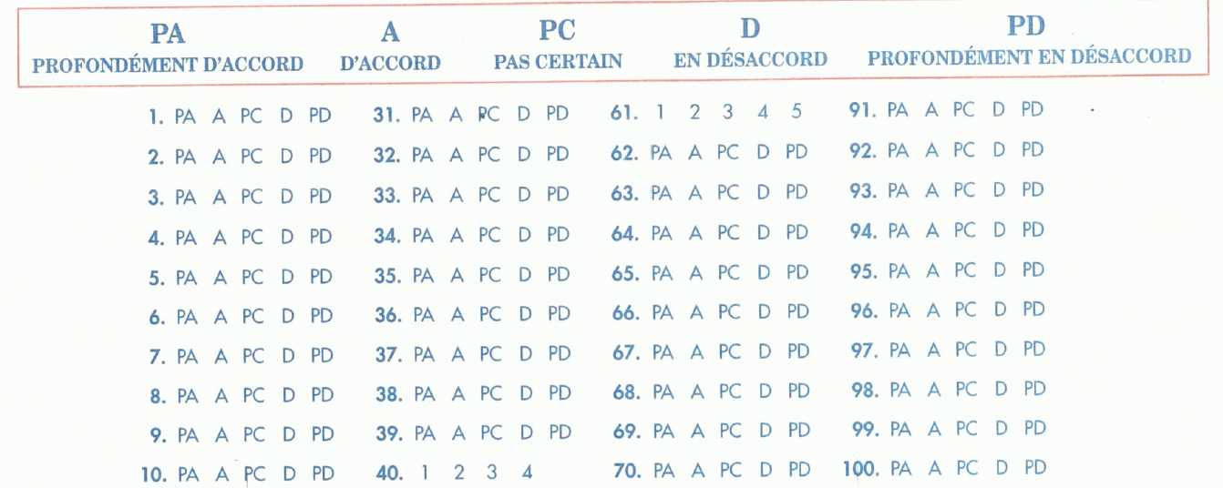 Je tente de codifier un questionnaire psychométrique papier que j'utilise dans mon travail, pour le mettre en Excel pour calculer automatique les résultats obtenus. Pour vous donner une idée du test, la personne doit choisir toujours les 5 mêmes options pour chaque question (étant PA/A/PC/D/PD).