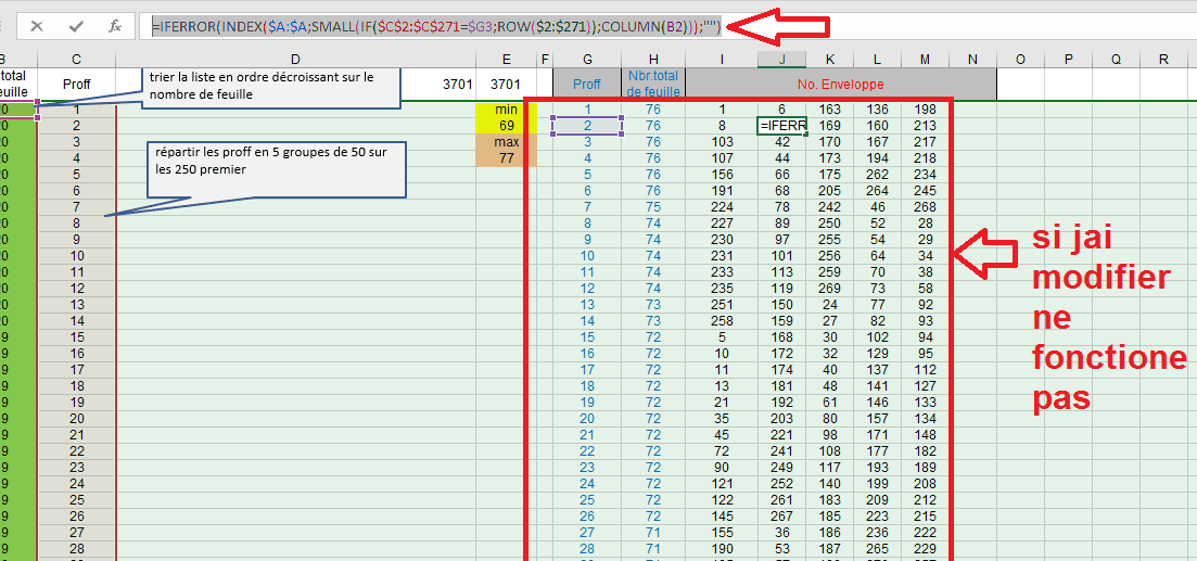 si tu veux que chaque prof ait le meme nombre de copie a corriger, tu fais la somme des copies divisée par 50 et le reste tu le repartis sur certains profs ils n'en auront qu'une de plus que leur collègue !