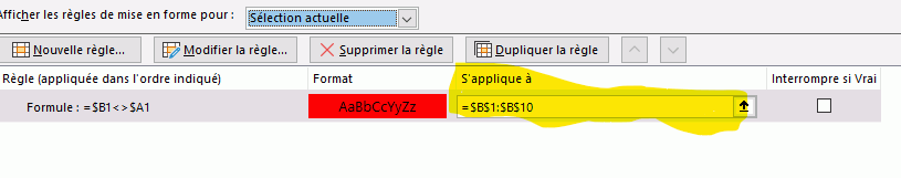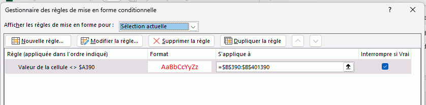 je souhaite faire en sorte qu'une cellule change de couleur quand celle ci est de valeur différente à celle de la cellule de gauche (colonne précédente). Pour ce point pas de souci. Mais je souhaite dupliquer ou étendre cette règle pour toutes les lignes de ma colonne (plus de 300), et là je n'y arrive pas.