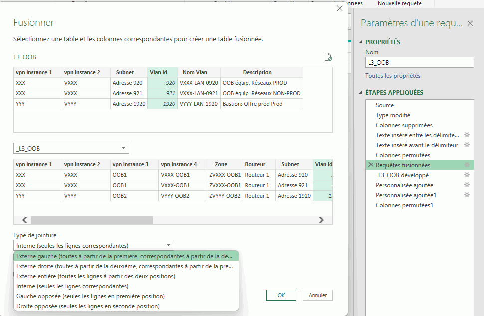 Effectivement, cette fois le fonctionnement ressemble un peu plus au but recherché. J'ai modifié le fait que la valeur référence doit être nom du vlan (et non pas l'id). Et supprimer les valeurs null dans la colonne nom vlan. Cela fonctionne.