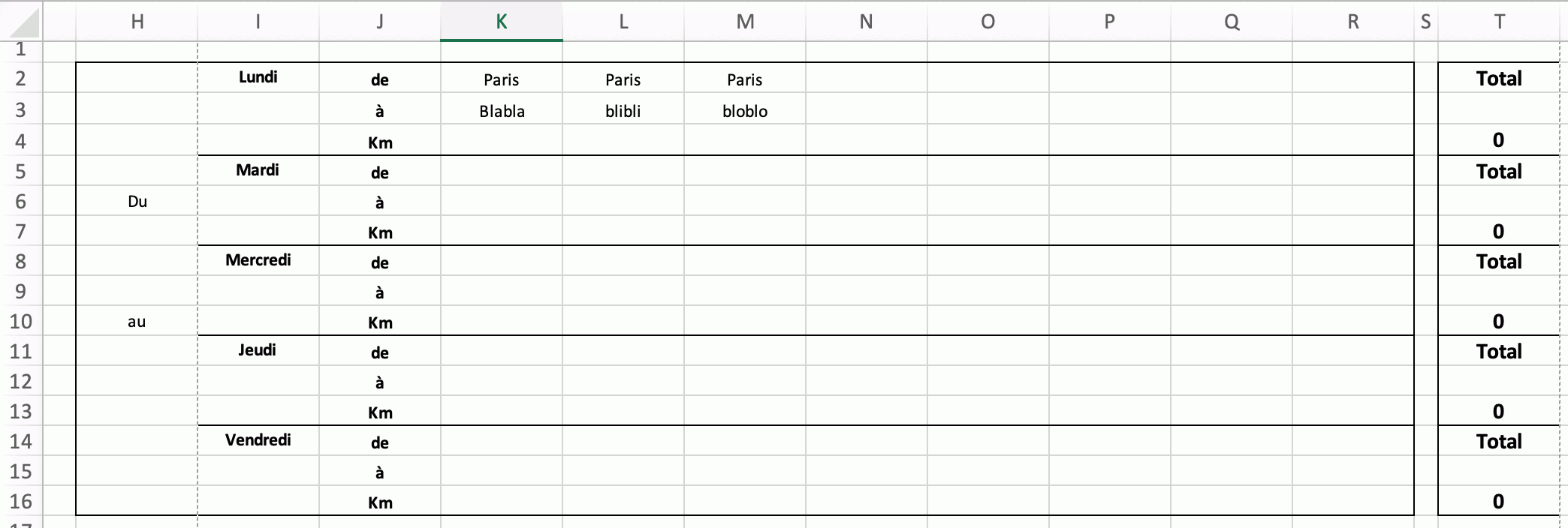 Je souhaiterais donc que dans mon premier tableau (ligne 4, 7, 10, 13, etc.) s'écrive le nombre de km total du deuxième tableau (Colonne F en fonction de la colonne A). Ma seule solution actuelle est d'additionner plusieurs fonction =SI(K3="blabla";F3;0)+SI(K3="Blibli";F4;0)+SI(K3="bloblo";F5;0).