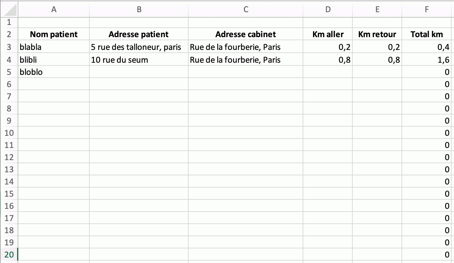 Pour mon activité professionnel, mon comptable me demander de réaliser un carnet de route avec les kilomètres parcourus pour aller chez mes patients (environs 4-5 par jours). Pour me facilité la tâche, j'ai réalisé un tableau que je tente "d'automatiser" à l'aide d'un autre tableau. Voici les screens shots :