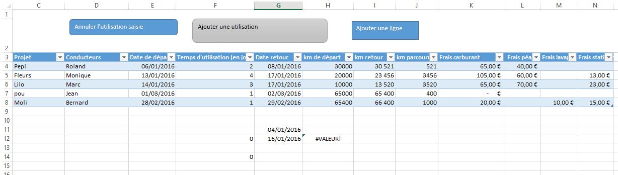 =SOMMEPROD((Tableau2[Frais carburant])*(Tableau2[Date de départ]>=G11)*(Tableau2[Date retour]<=G12))