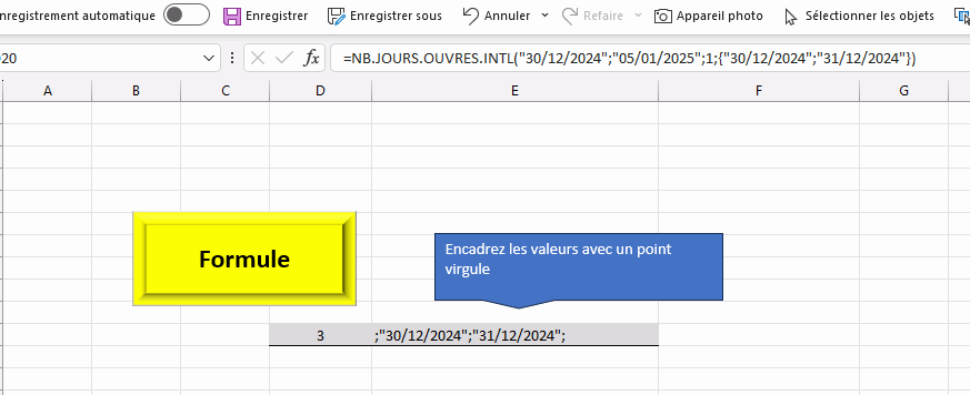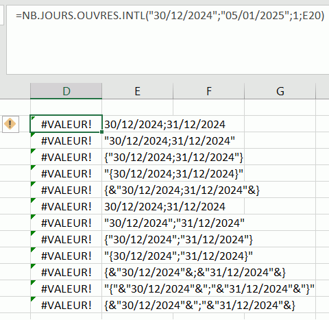 =NB.JOURS.OUVRES.INTL("30/12/2024";"05/01/2025";1;{"01/01/2025";"02/01/2025"})Y'a plus qu'à trouver le code pour { et } et ma fonction perso fonctionnera (j'imagine).