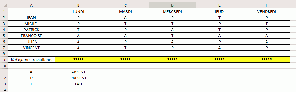 je souhaite calculé le taux d'agents travaillant par jour (B9 / C9 / D9 / E9 / F9)