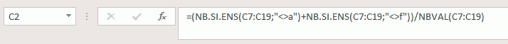 =(NB.SI.ENS(B2:B7;"<>A")+NB.SI.ENS(B2:B7;"<>F"))/NBVAL(B2:B7)