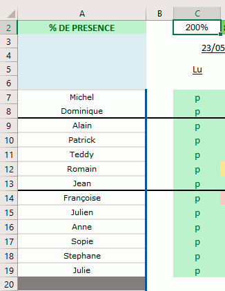 mais cela me donne 200%... pourquoi ? alors que cela devait etre 100% etant donné qu'ils sont tous "présent" "p"