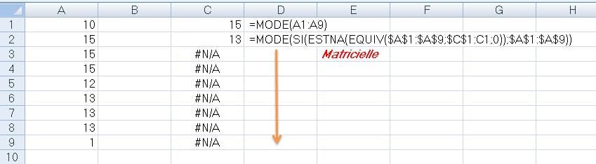 je n'arrive pas avoir la deuxième valeur, en fait lorsqu'il y égalité moi je n'ai pas de N/A dans la cellules. Votre formule me marque la même valeur que avec mode !