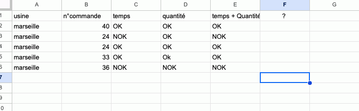 Bonjour, je suis a la recherche d'une formule qui me permettrait de mettre en colonne F si la commande est NOK ou OK. A savoir que si une ligne de la commande 24 est NOK, l'ensemble des autres lignes de la commande son NOK