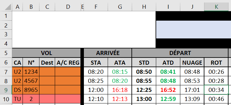 Sachant que la compagnie peut être différente sur chaque lignes de la colonne A, j'aimerais que K détecte automatiquement la compagnie et le timing souhaité .