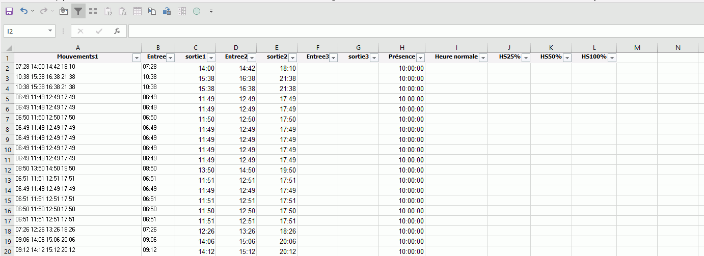Fonction SI + pointageLe 18/05/2022 à 18:56Lombardo10Membre habituéMessages76Excel2021Inscrit27/11/2020EmploiCDG Bonjour à tous,je revient vers vous autre fois, car j'ai un soucis par rapport à la fonction SI j'ai une base de données et je veux une fonction pour :Pour la colonne I : si H>8 et dernière sortie avant 19hPOUR LA COLONNE J : si H>8 et dernière sortie est entre 19h et 20h l'écart entre la présence et l'heure normalepour la colonne K : si H>8 ; et la dernière sortie est supérieur à 20h l'écart entre la présence et l'heure normaleMerci pour votre collaboration 19pointage-2022.zip (275.47 Ko) 20pointage-2022.xlsx (227.62 Ko) Le 20/05/2022 à 18:26InvitéBonjour LombardoDu conditionnel serait beaucoup mieux dans votre demande merci de faire le nécessaire SVP Car à mes yeux "je veux" est un ordre Merci de votre compréhensionA+Rechercher des sujets similaires à "fonction pointage"ForumsExcel - VBAFonction SI + pointage