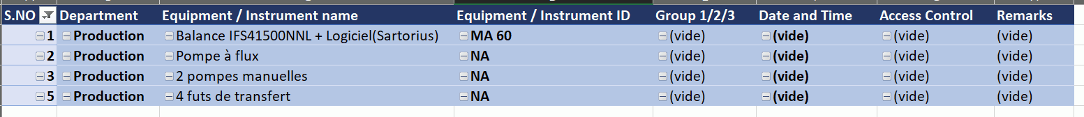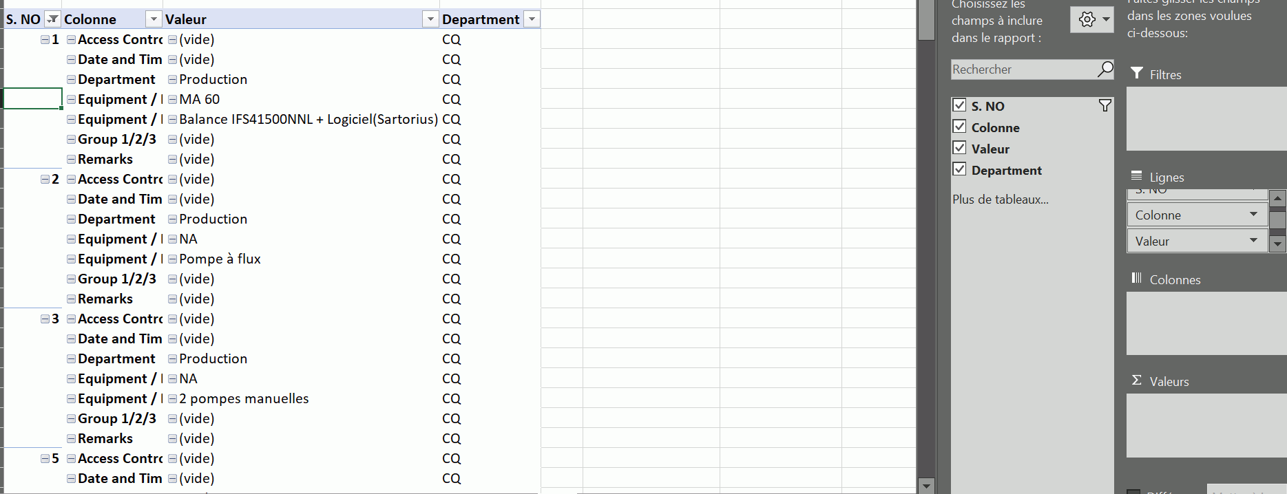 Pour information, j'ai modifié les paramètres des 4 champs (S. NO / Department / Colonne / Valeur) de la façon suivante :