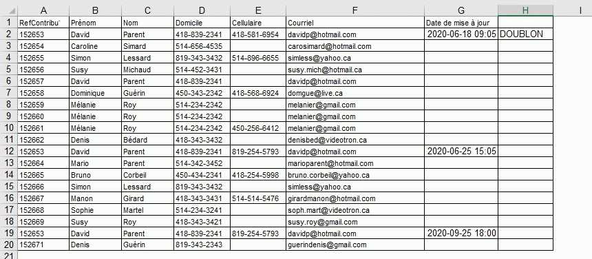 Dans mon exemple, l'élément qui est en doublon est David Parent (152653) qui se retrouve 3 fois, est-ce qu'on peut conserver l'enregistrement avec la Date de mise à jour 2020-09-25 18:00 (ligne 19) qui est le plus récente et les lignes 1 et 12 se supprimeraient ?