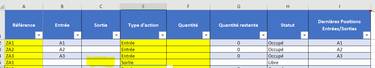 les colonnes B et C ne contiennent plus de formules, c'est une macro qui détecte le changement d'état "Entrée" ou "Sortie" dans la colonne E qui gérera en fonction des disponibilités de l'entrepôt.