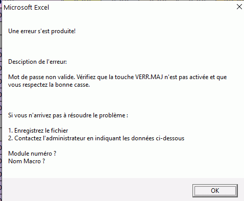 MsgBox "Une erreur s'est produite!" & Chr(13) & Chr(10) & Chr(13) & Chr(10) & Chr(13) & Chr(10) & Chr(13) & Chr(10) & "Desciption de l'erreur:" & Chr(13) & Chr(10) & Chr(13) & Chr(10) & Err.Description & Chr(13) & Chr(10) & Chr(13) & Chr(10) & Chr(13) & Chr(10) & Chr(13) & Chr(10) & "Si vous n'arrivez pas à résoudre le problème :" & Chr(13) & Chr(10) & Chr(13) & Chr(10) & "1. Enregistrez le fichier" & Chr(13) & Chr(10) & "2. Contactez l'administrateur en indiquant les données ci-dessous" & Chr(13) & Chr(10) & Chr(13) & Chr(10) & "Module numéro" & " ? " & Chr(13) & Chr(10) & "Nom Macro" & " ? "J'ai déjà trouvé comment insérer le numéro du module !