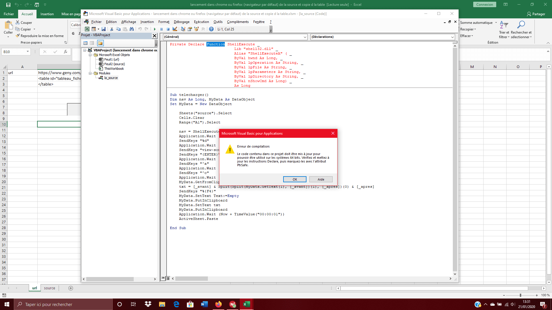 Ensuite clique sur le bouton de ce fichier ... attention, la procédure dure 10 secondes, il y a des tempos partout car le but est de laisser excel dialoguer avec firefox.