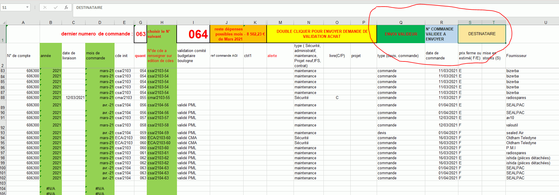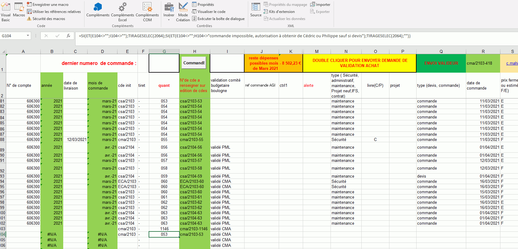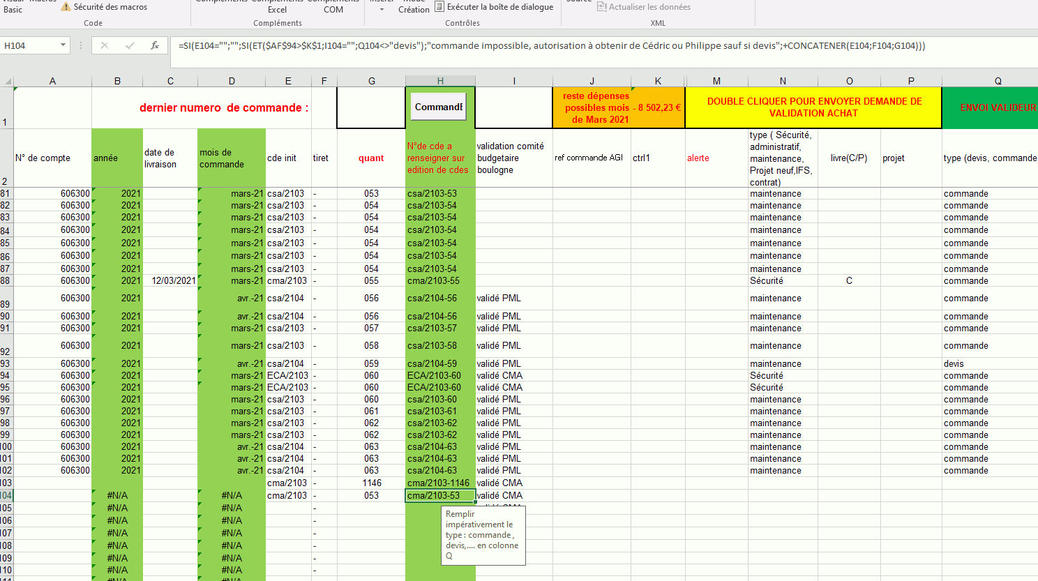 J'ai tenté de coller ton code mais pour la plage à définir je dois mal m'y prendre...Le but de la formule sous excel colonne H est d'empêcher de générer un numéro de en colonne E si le budget restant ne le permet pas (K1). Apparît donc un texte commande impossible.... en colonne H . Donc lorsqu'aapparaît ce message je génére automatiquement un email de demande validation et un msgbox préviens l'utilisateur qu'une demande à été initiée