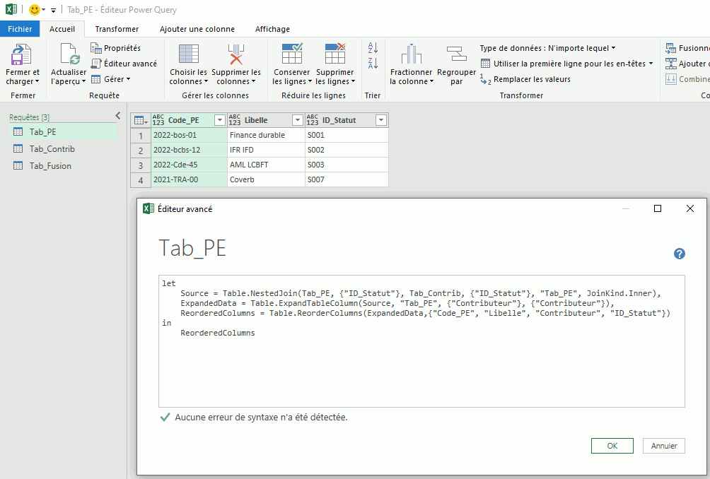 Ensuite la formule utilisée fonctionne. J'enregistre les résultats de la requête dans le troisième onglet Tab_Fusion et je nomme la requête List_PE_Contrib