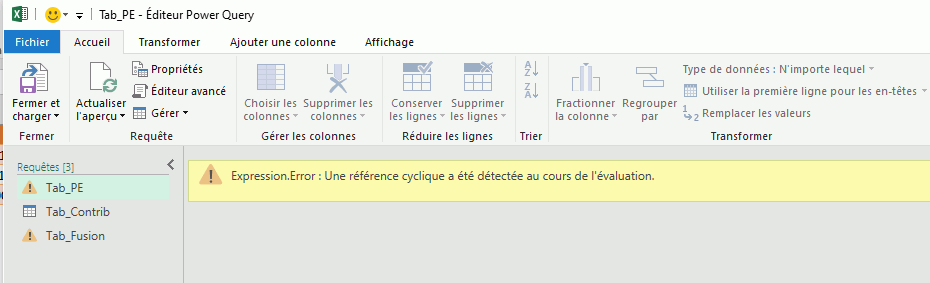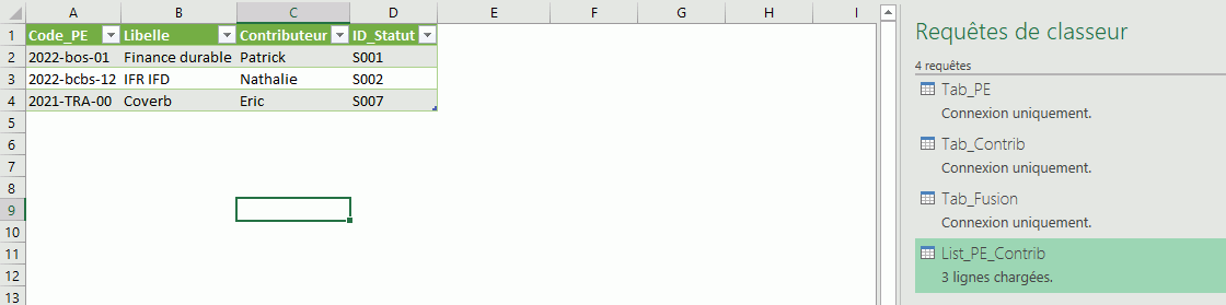 En revanche lorsque je mets à jour les deux premiers onglets (Tab_PE et Tab_Contrib) la table Tab_Fusion n'est pas mise à jour automatiquement. je suis obligé soit de cliquer sur le nom de la requête List_PE_Contrib pour faire actualiser, soit de passer par le menu Données/Actualiser tout.