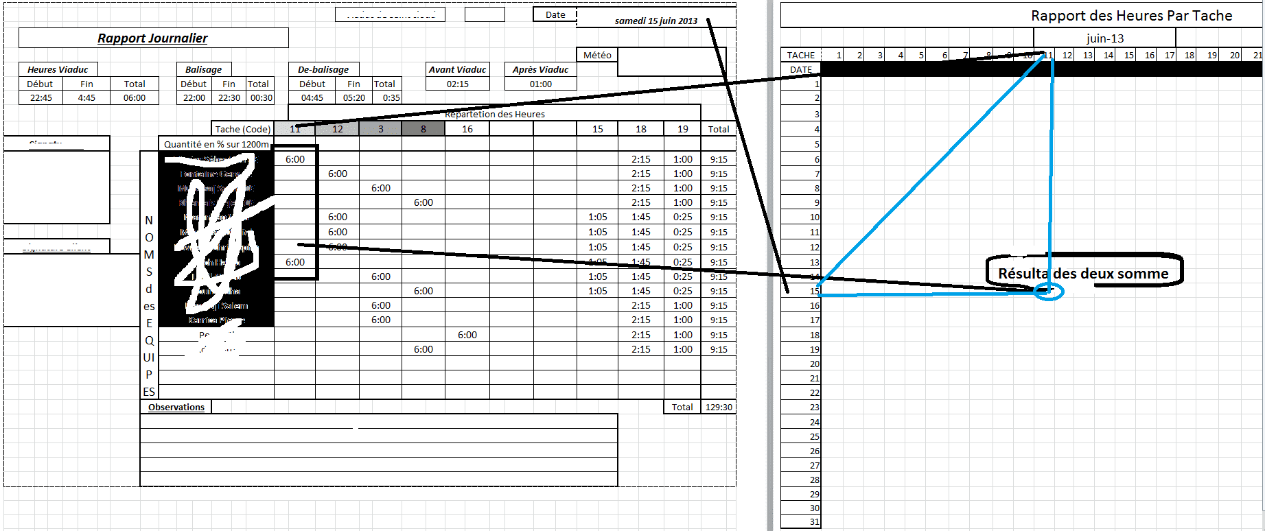 je voudrait faire la somme des heure d'une tache du rapport journalier et les envoyer sur rapport des heure à la bonne date et à la bonne tache.