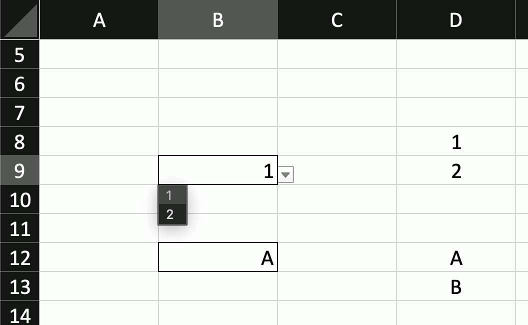 Sur la première (B9), je peux choisir entre 1 et 2, sur la seconde (B12) entre A et B.