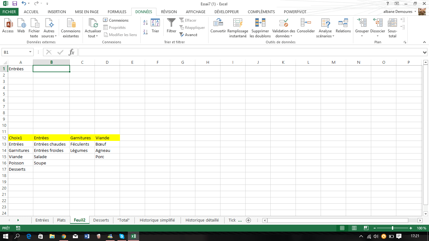 Sur l'image si jointe: j'aimerai que si le choix 1 c'est "Entrée" la liste déroulante de la colonne B2 soit "Entrées chaudes, entrées froides,salade ou soupe" et si le choix 1 c'est "garnitures" la liste déroulante de la colonne B2 deviennent "féculents ou légumes"...