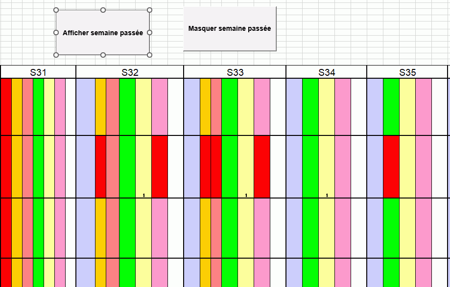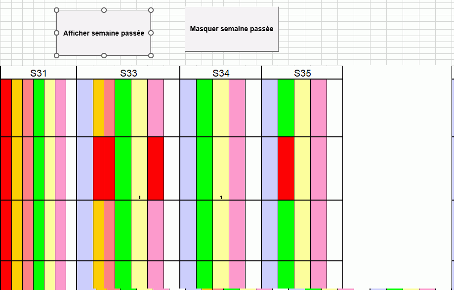 Je vous joint la photo de mon tableau excel. Pour exemple, en cliquant une fois sur le bouton "Masquer semaine passée", je puisse masquer la semaine 31 et en recliquant encore une fois sur le même bouton, je puisse masquer la semaine 32 (et ainsi de suite).